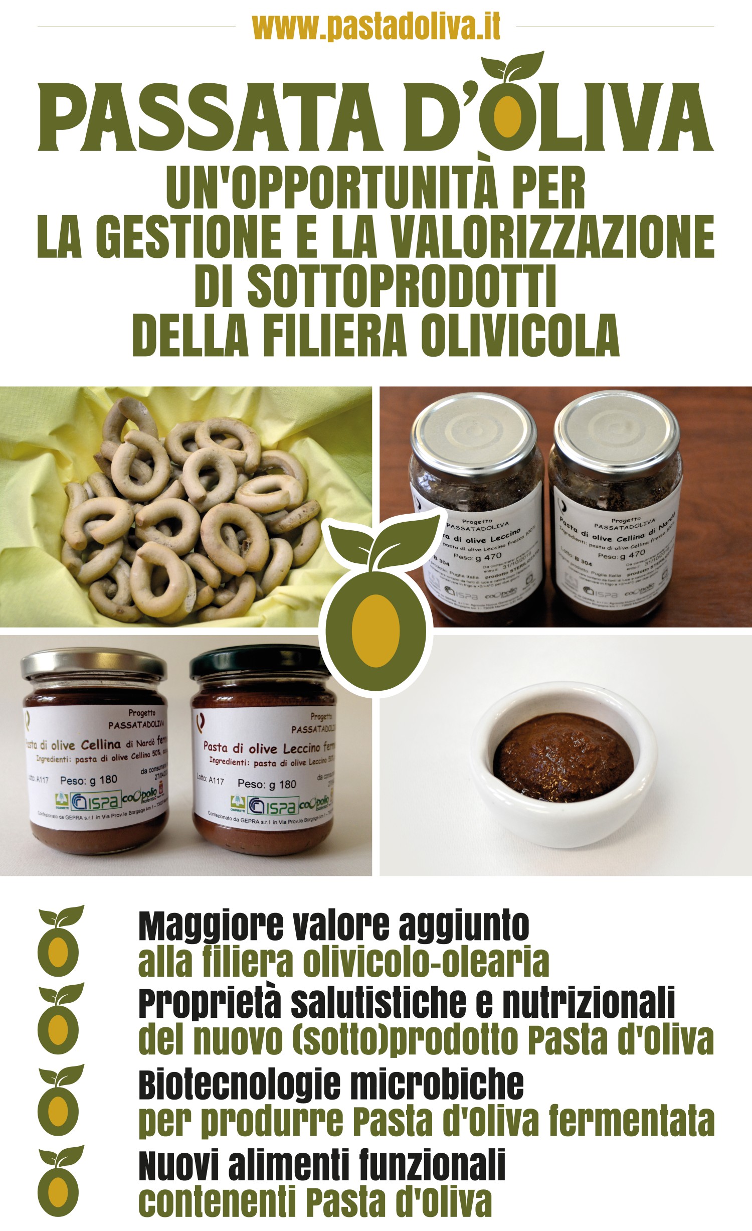 L’idea è quella di valorizzare i sottoprodotti derivanti dalla molitura effettuata con il nuovo decanter DMF. Il sottoprodotto che si ottiene con questo decanter (patè d’oliva) è costituito da polpa e buccia. Questo patè una volta stabilizzato per via termica, chimica o per fermentazione (mediante batteri lattici e lieviti selezionati), sarà utilizzato per realizzare prodotti da forno (tarallini, crackers e biscotti) con proprietà funzionali e con un maggiore valore aggiunto.