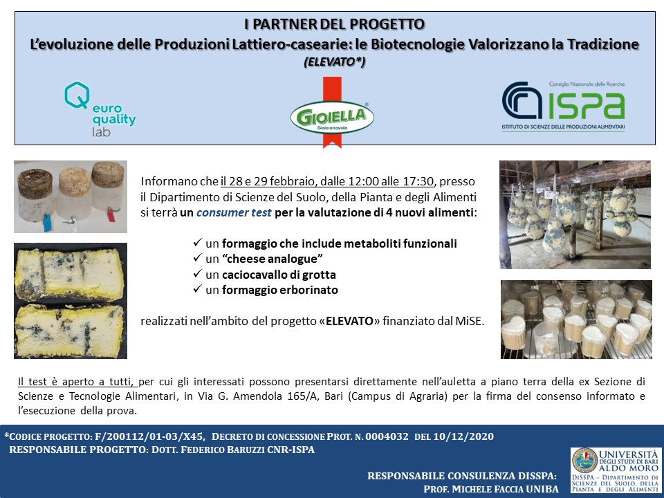 Il Dott. Federico Baruzzi e la Dott.ssa Antonella Susca, responsabili delle attività del CNR-ISPA del progetto ELEVATO, “L’evoluzione delle Produzioni Lattiero-casearie: le Biotecnologie Valorizzano la Tradizione” in accordo con i partner informano che il 28 e 29 febbraio, dalle 12:00 alle 17:30, presso il Dipartimento di Scienze del Suolo, della Pianta e degli Alimenti si terrà un consumer test per la valutazione di 4 nuovi alimenti realizzati nell’ambito del progetto «ELEVATO» finanziato dal MiSE.